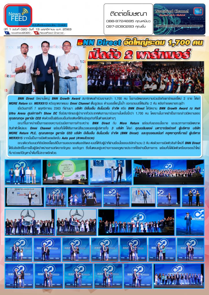 BNN Direct จัดงานใหญ่ BNN Growth Award สมาชิกตบเท้าร่วมงานกว่า 1,700 คน ในงานจัดแถลงความร่วมมือกับพาร์ทเนอร์ใหม่ 2 ราย ได้แก่ MORE Return และ MERX915 หวังรุกตลาดแบบ Omni Channel เต็มรูปแบบ ด้านบอสใหญ่ใจป้ำ แจกรถเบนซ์ให้แม่ทีม 2 คัน หลังทำยอดขายทะลุเป้า