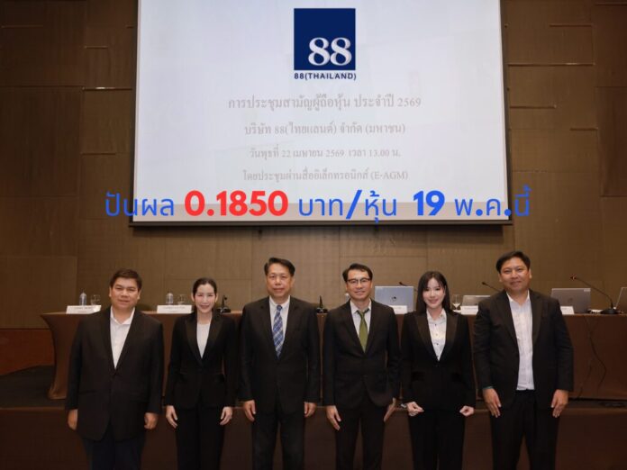 นายดุษิต จงสุทธนามณี ประธานกรรมการ และนางสาวนพรัตน์ มาลัยวงค์ ผู้ก่อตั้งและกรรมการ บริษัท 88(ไทยแลนด์) จำกัด (มหาชน) “88TH” พร้อมด้วยคณะกรรมการบริษัทฯ จัดการประชุมสามัญผู้ถือหุ้นประจำปี 2569 ผ่านสื่ออิเล็กทรอนิกส์ (E-AGM) เพื่อรายงานผลการดำเนินงานงวดปี 2568 ที่เติบโตอย่างโดดเด่น โดยมีกำไรสุทธิ 101 ล้านบาท เพิ่มขึ้นถึง 45.23 ล้านบาท หรือ 81.10% (YoY) ดันอัตรากำไรสุทธิ (Net Profit Margin) จาก 11.67% ปีก่อน ทะยานขึ้นไปแตะ 15.36% และพิจารณาวาระสำคัญต่างๆ โดยที่ประชุมมีมติอนุมัติครบทุกวาระตามข้อเสนอของคณะกรรมการ สะท้อนถึงศักยภาพ และความเชื่อมั่นต่อธุรกิจของบริษัทฯ