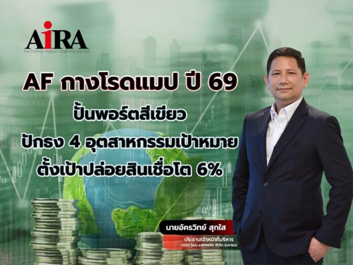 บมจ.ไอร่า แฟคตอริ่ง (AF) พร้อมขยับตัวสู่ ‘Finance for Future’ ตั้งเป้าพอร์ตปี 69 โต 6% มุ่งเน้นขยายพอร์ตกลุ่ม ESG Finance และ Green Loan ตอบโจทย์ภาคธุรกิจที่ต้องการ ทรานส์ฟอร์มสู่ความยั่งยืน พร้อมเร่งวางกลยุทธ์ขยาย 4 พอร์ตกลุ่มอุตสาหกรรม “อาหารและเครื่องดื่ม, บริการและอุปกรณ์ทางการแพทย์, ผู้ผลิตชิ้นส่วนรถยนต์ และอุปกรณ์สารสนเทศ (IT)” หวังช่วยต่อยอดขีดความสามารถทางการแข่งขัน SMEs ไทย