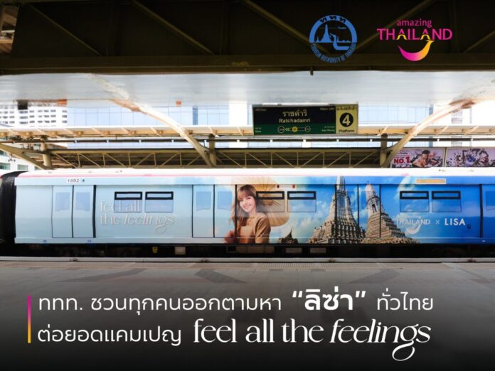 หลังจากที่ ททท. ได้ปล่อยภาพยนตร์โฆษณาใหม่ “feel all the feelings” ถ่ายทอดมุมมองของ “ลิซ่า” ผ่านคำถามชวนค้นหาว่า What does Thailand feel like? หรือ “ประเทศไทยให้ความรู้สึกแบบไหน” ก่อนจะพาผู้ชมออกเดินทางไปสัมผัสเสน่ห์ของการท่องเที่ยวไทยในหลากหลายมิติ ทั้งช่วงเวลาแห่งการพักผ่อน การเติมพลังใจ และความงดงามในทุกโมเมนต์ของชีวิต ที่สะท้อนเอกลักษณ์เฉพาะตัวของประเทศไทยซึ่งหาไม่ได้จากที่อื่นบนโลก ผ่านสถานที่ท่องเที่ยวอันงดงามทั่วประเทศไทย ล่าสุด ททท. ได้ต่อยอดแคมเปญฯ ด้วยการชวนคนไทย “ตามรอยลิซ่า” ให้ผู้คนร่วมสนุกกับการออกตามหาภาพ “ลิซ่า” จากแคมเปญโฆษณาล่าสุด ที่พบเจอได้ผ่านสื่อโฆษณาหลากหลายรูปแบบ ไม่ว่าจะเป็นรถไฟฟ้าบีทีเอสสายสีเขียวอ่อน (สายสุขุมวิท) และสีเขียวเข้ม (สายสีลม) ถูกเนรมิตให้เป็นสื่อโฆษณาแบบหุ้มขบวน ถ่ายทอดบรรยากาศของแคมเปญ Amazing Thailand x LISA “feel all the feelings” ให้ผู้โดยสารได้สัมผัสอารมณ์ความรู้สึกระหว่างการเดินทางในชีวิตประจำวัน โดยจะทำการเผยแพร่ตั้งแต่วันนี้ถึงพฤษภาคม 2569 ไม่เพียงแค่ตกแต่งภายนอกเท่านั้นแต่ภายในขบวนรถไฟฟ้ายังถูกตกแต่งด้วยภาพลักษณ์ของแคมเปญอย่างโดดเด่น ควบคู่กับภาพสถานที่ท่องเที่ยวสำคัญจากทั่วประเทศไทย พร้อมวิ่งผ่านแลนด์มาร์คใจกลางเมือง ครอบคลุม 9 สถานีสำคัญ ได้แก่ สถานีสยาม (ทั้งฝั่งบนและฝั่งล่าง), สถานีพญาไท, สถานีอนุสาวรีย์ชัยสมรภูมิ, สถานีชิดลม, สถานีอ่อนนุช, สถานีช่องนนทรี, สถานีศาลาแดง, สถานีอโศก และสถานีพร้อมพงษ์ แคมเปญนี้ยังสร้างประสบการณ์การพบเจอ “ลิซ่า” ระหว่างการเดินทาง ชวนให้ผู้โดยสารร่วมเก็บภาพความประทับใจตลอดเส้นทาง และร่วมสัมผัสทุกอารมณ์ความรู้สึกไปพร้อมกันกับ feel all the feelings