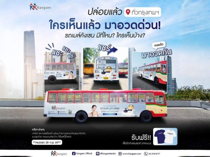 บริษัท Kangzen-Kenko International หรือ “คังเซน” เดินหน้าสร้างสีสันทางการตลาดครั้งใหม่ ด้วยการเปิดตัวแคมเปญสุดสนุก “ใครเห็นแล้ว..มาอวดด่วน รถเมล์คังเซน มีที่ไหน? ใครเห็นบ้าง?” ชวนแฟนๆ และประชาชนร่วมตามหา “รถเมล์คังเซน” ที่กำลังวิ่งให้เห็นตามเส้นทางต่างๆ พร้อมร่วมแชร์ภาพและประสบการณ์เมื่อพบเห็น