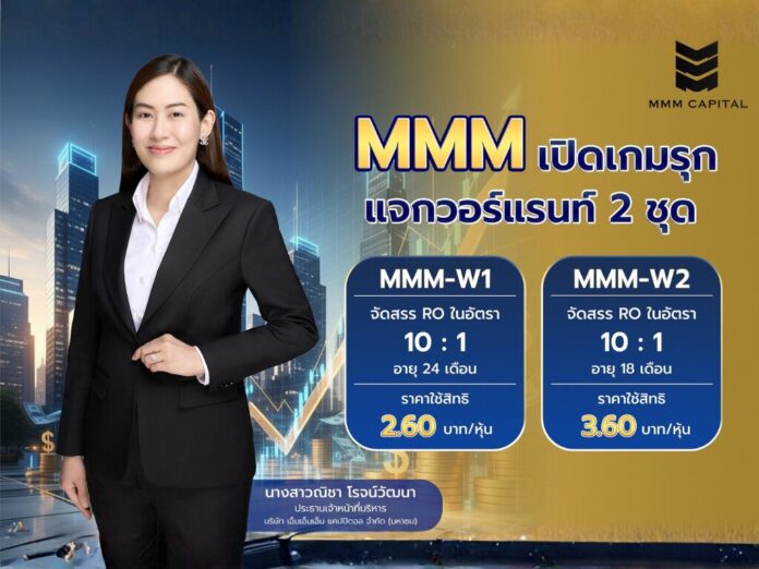 บมจ.เอ็มเอ็มเอ็ม แคปปิตอล หรือ MMM เดินหน้าต่อจิ๊กซอว์ทางธุรกิจ เปิดเกม รุกฆาต! หลังบอร์ดไฟเขียว แจกวอร์แรนท์ MMM-W1 และ MMM-W2 จำนวน 2 ชุดรวด 72.6 ล้านหน่วย ดึงนักลงทุนร่วมทัพ ขยายฐานทุนสู่การสยายปีกการลงทุนในอนาคต พร้อมระบุเงินที่ได้จากการแปลงสภาพวอร์แรนท์เพื่อขยายพอร์ตอสังหาฯ สู่การสร้าง Recurring Income
