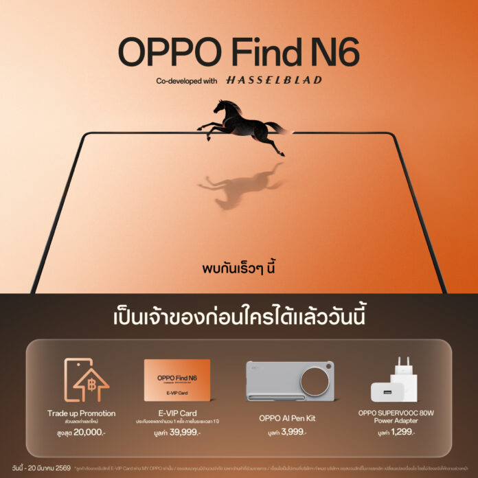 และพิเศษสำหรับลูกค้าที่สั่งจอง OPPO Find N6 ล่วงหน้า ระหว่างวันที่ 12 – 20 มีนาคม 2569 จะได้รับของสมนาคุณรวมมูลค่า 45,297 บาท ประกอบด้วย