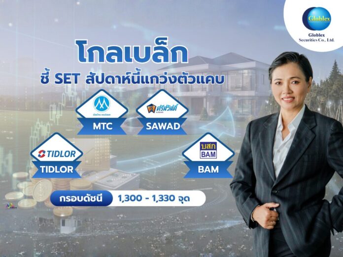 บล. โกลเบล็ก (GBS) มองดัชนี SET สัปดาห์นี้แกว่งตัวในกรอบ 1,300–1,330 จุด จากแรงหนุนเศรษฐกิจสหรัฐฯฟื้นตัว บวกความสัมพันธ์สหรัฐฯ–จีนดีขึ้น แนะจับตาประเด็นการฟ้องร้องเจพีมอร์แกน แนะนำหุ้น MTC, SAWAD, TIDLOR และ BAM ที่ได้ประโยชน์จากดอกเบี้ยขาลง